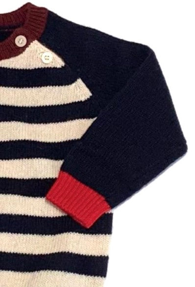 Maglia in lana girocollo, con bottoncini di chiusura sulla spalla, tessuto rigato, inserti colorati.