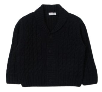 Maglia cardigan in lana, motivo a treccia, con collo sciallato, con inserti colorati, bottoncini di chiusura.