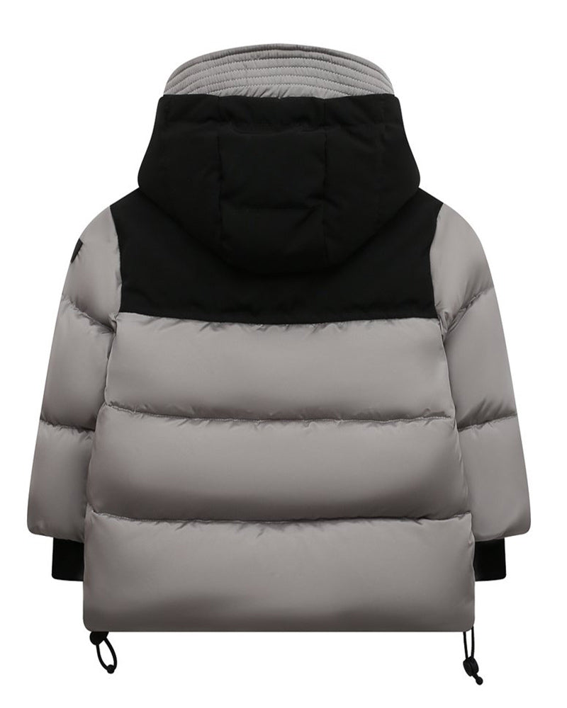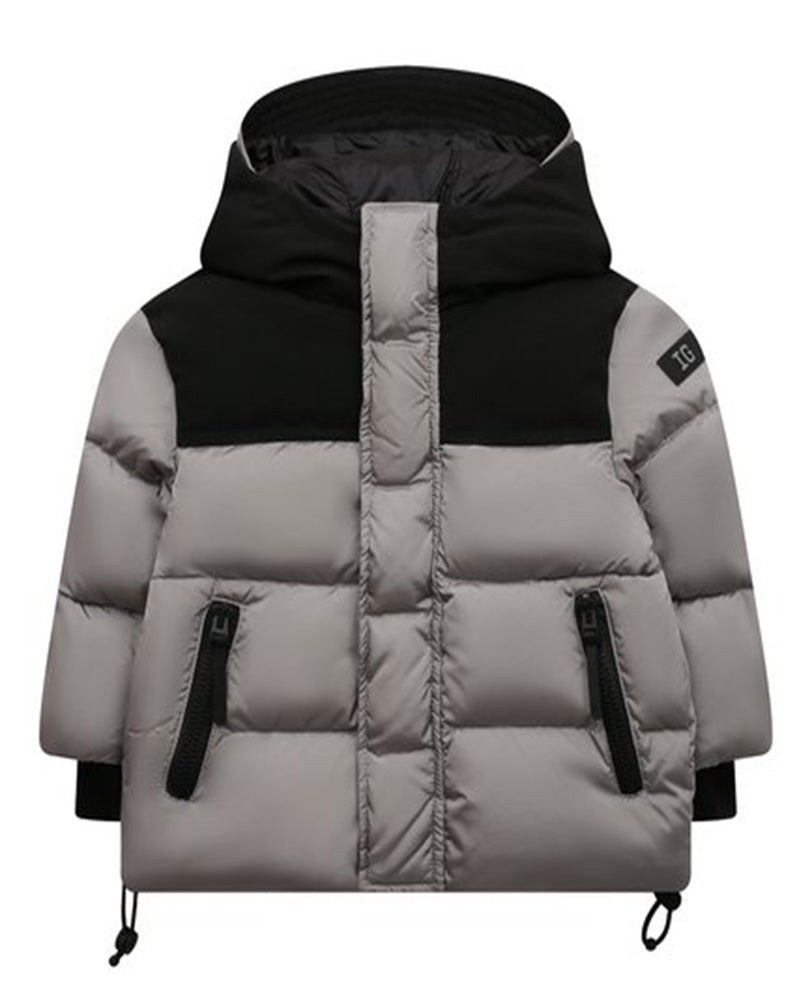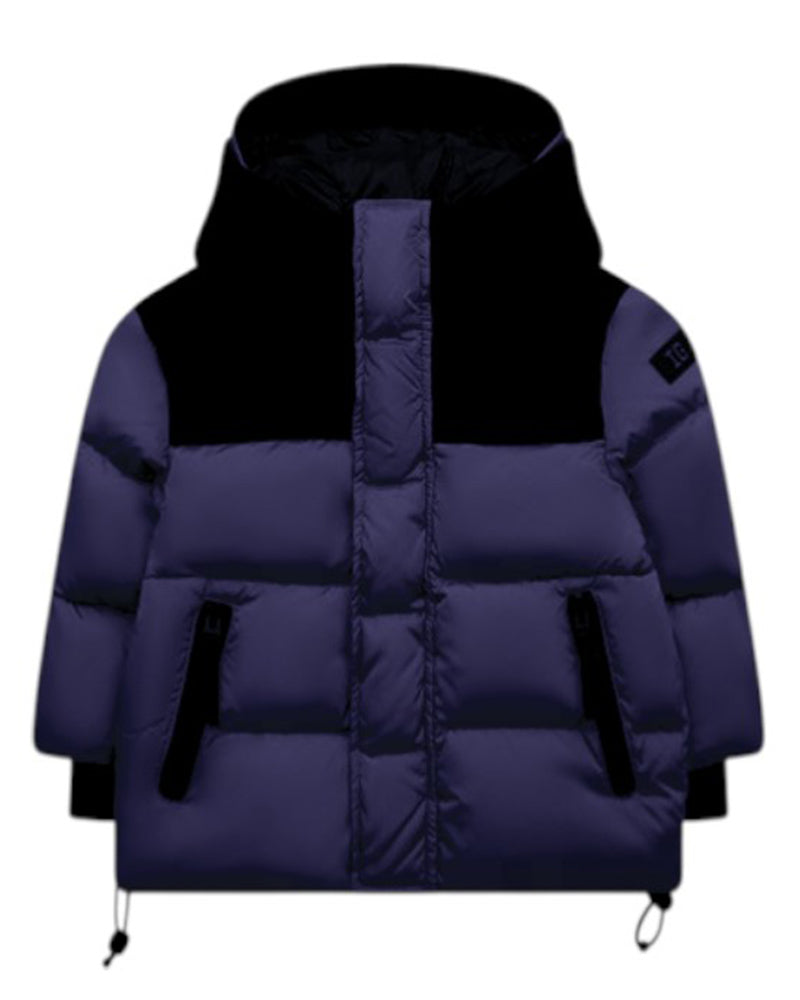 Giubbino imbottito da bambino, realizzato in poliammide. Presenta design trapuntato, cappuccio fisso con visiera, chiusura frontale con zip e bottoni a pressione, maniche lunghe con polsi a coste e due tasche laterali all'americana con zip. È decorato con patch logo applicata sulla manica.