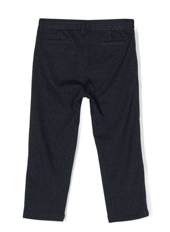 Pantalone tasca america, tessuto effetto gessato, chiusura frontale con zip e bottone, tasca sul retro.
