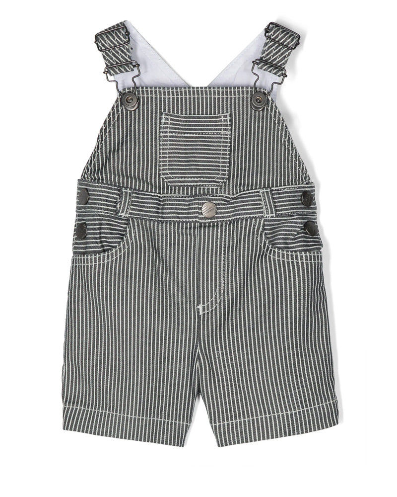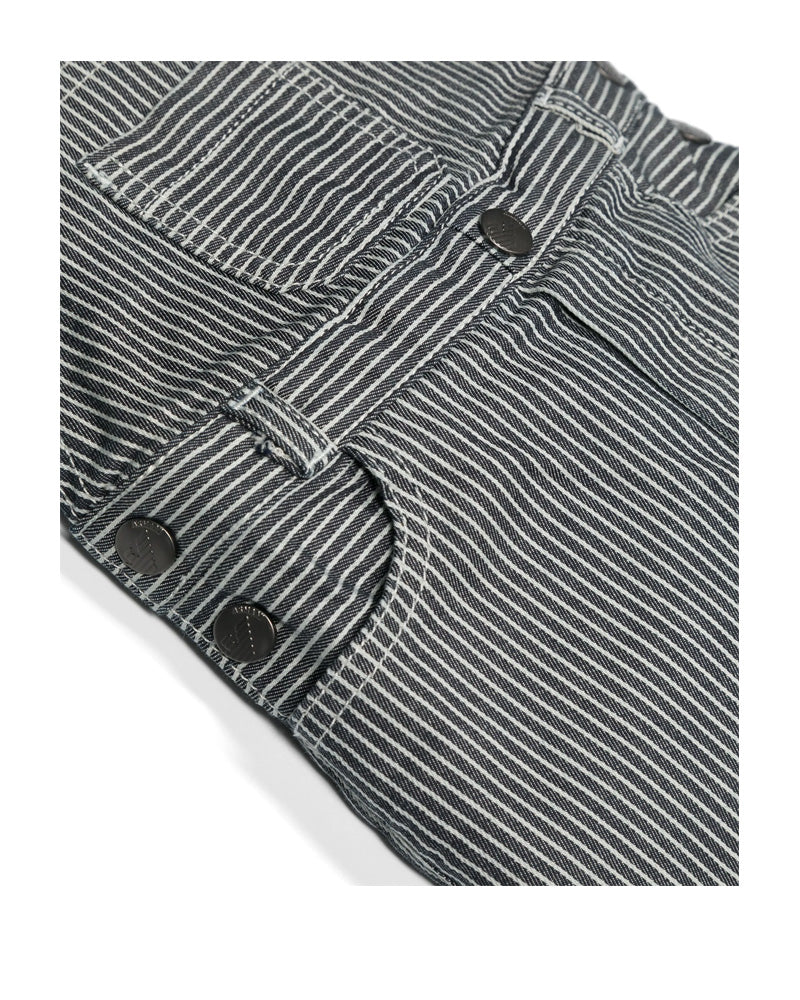 Salopette in misto cotone elasticizzato con tessuto in twill e motivo a righe verticali. Il modello presenta spalline regolabili, tasca frontale applicata e design senza maniche. Dotata di vita elasticizzata sul retro per una vestibilità confortevole, chiusura laterale con abbottonatura automatica e passanti in vita. Completano il capo due tasche laterali a filetto, due tasche posteriori applicate e un ricamo con logo sul retro.