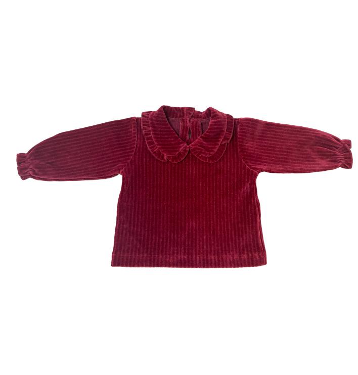 Maglia in velluto millerighe, colletto tondo, chiusura con bottoni sul retro.