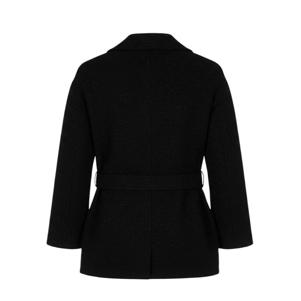 Cappotto doppiopetto realizzato in misto lana con dettagli lamé. Presenta collo a revers, chiusura frontale con bottoni, cintura in vita con placca logo, maniche lunghe e due tasche laterali a filetto.