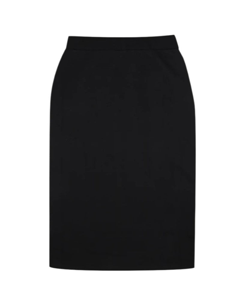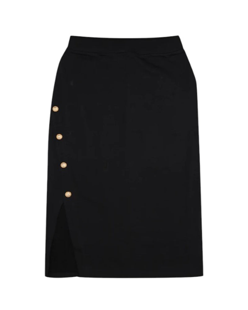 Gonna longuette nera da bambina realizzata cotone sgarzato, è caratterizzata da vita elasticizzata, spacco laterale e bottoni decorativi color oro sul davanti.