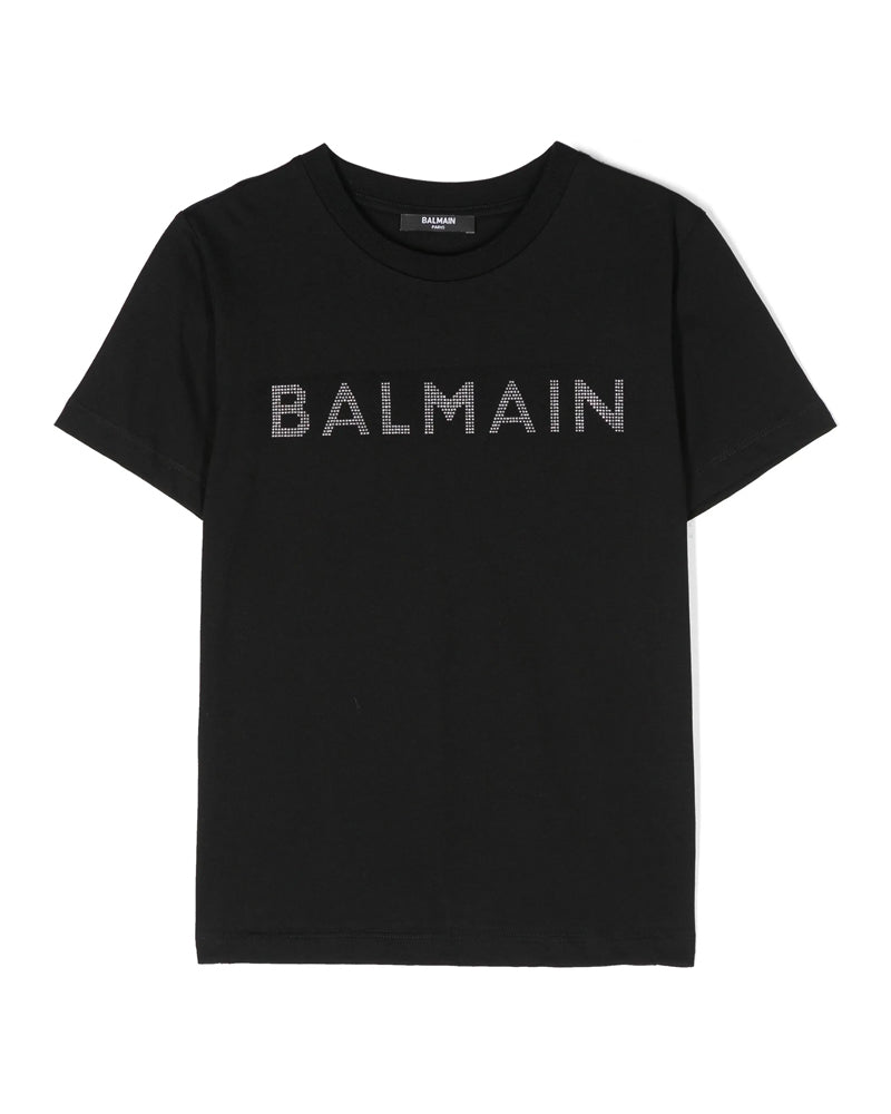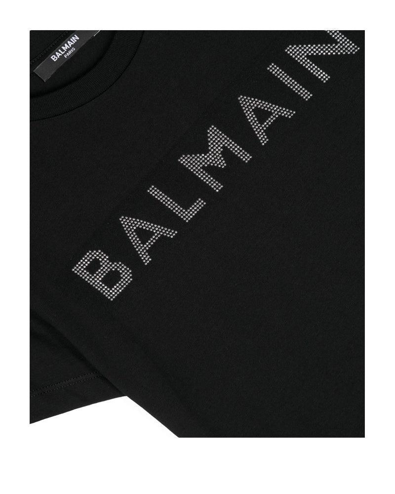 T-shirt con girocollo e maniche corte, caratterizzata da logo decorato con cristalli e dettaglio borchiato sul petto. Completano il modello etichetta logo interna e orlo dritto.