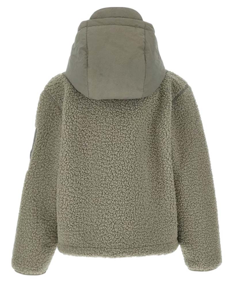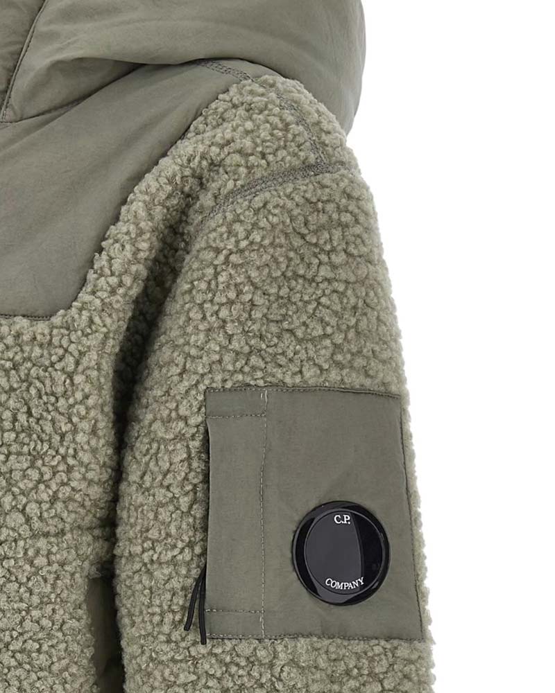Giubbino realizzato in eco-shearling con inserti in poliestere. Presenta cappuccio fisso, maniche lunghe con polsi elasticizzati, chiusura frontale con zip e bottoni, due tasche frontali, fodera in pile e orlo dritto. È decorato con lente C.P. Company applicata sulla manica.
