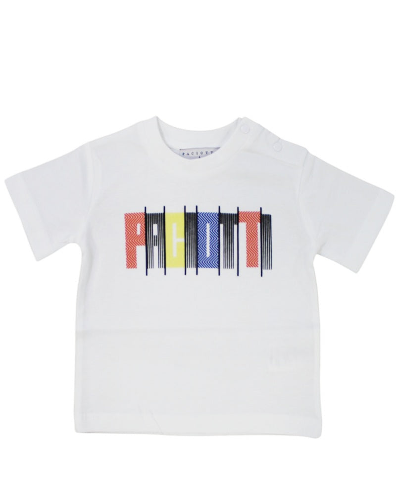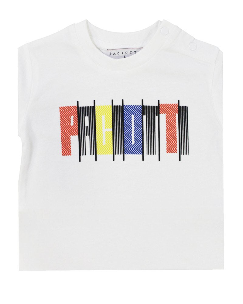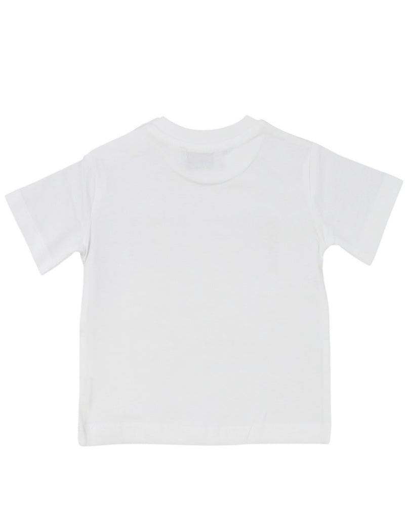 T-shirt realizzata in cotone, girocollo, maniche corte, logo stampato in contrasto sul davanti, clips di chiusura sulle spalle.
