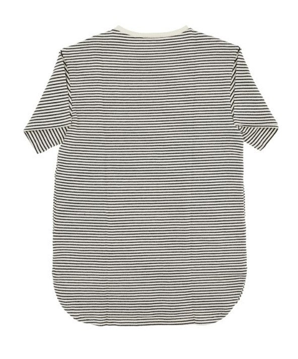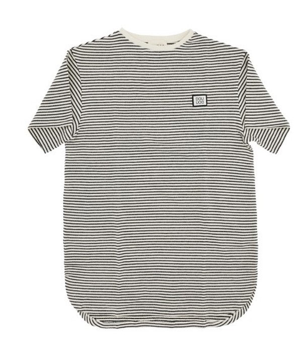 T-shirt girocollo in filo di cotone, manica corta, fantasia a righe, logo applicato sul davanti.