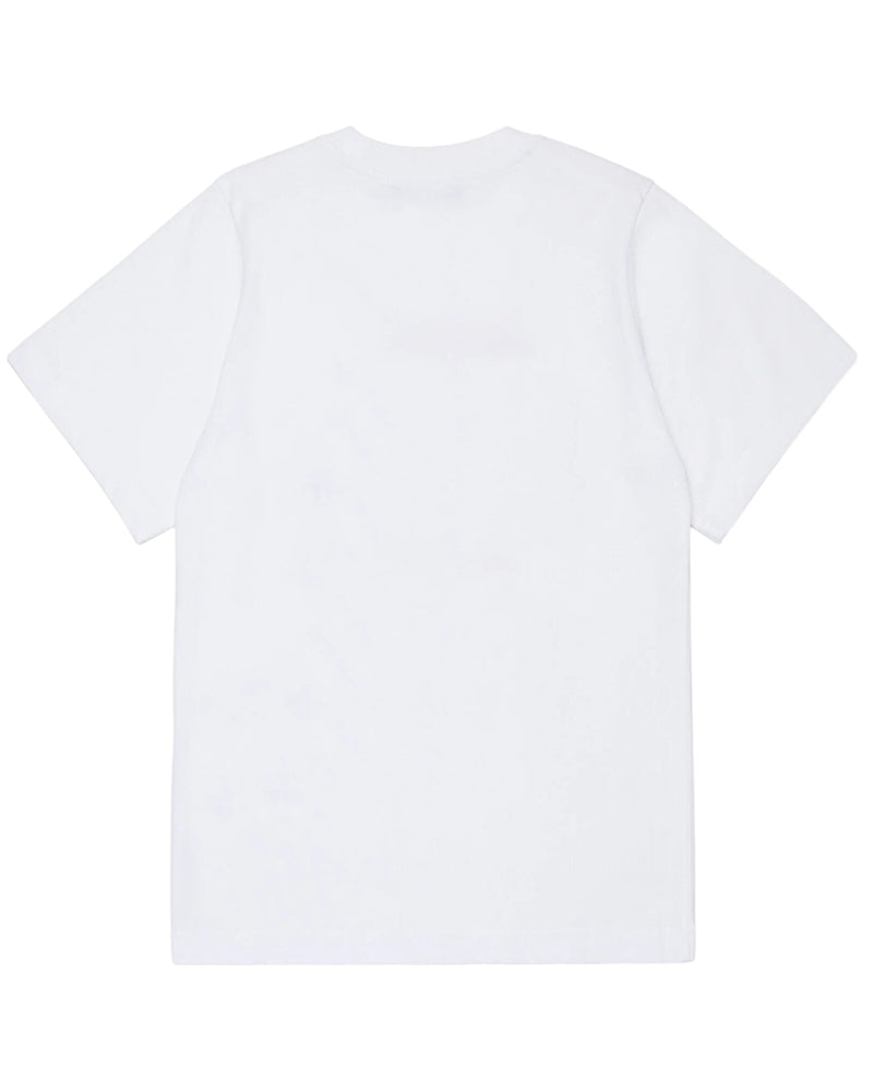 T-shirt bianca unisex realizzata in jersey di cotone. Presenta collo tondo, maniche corte e orlo dritto. È decorata con stampa logo sulla parte anteriore.