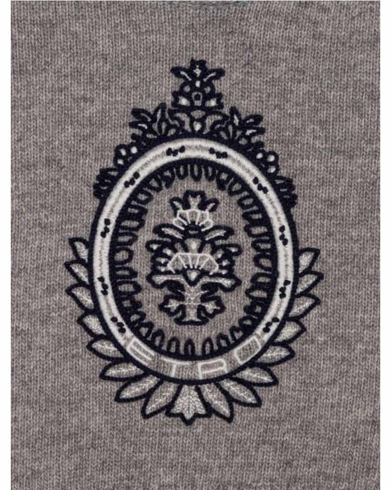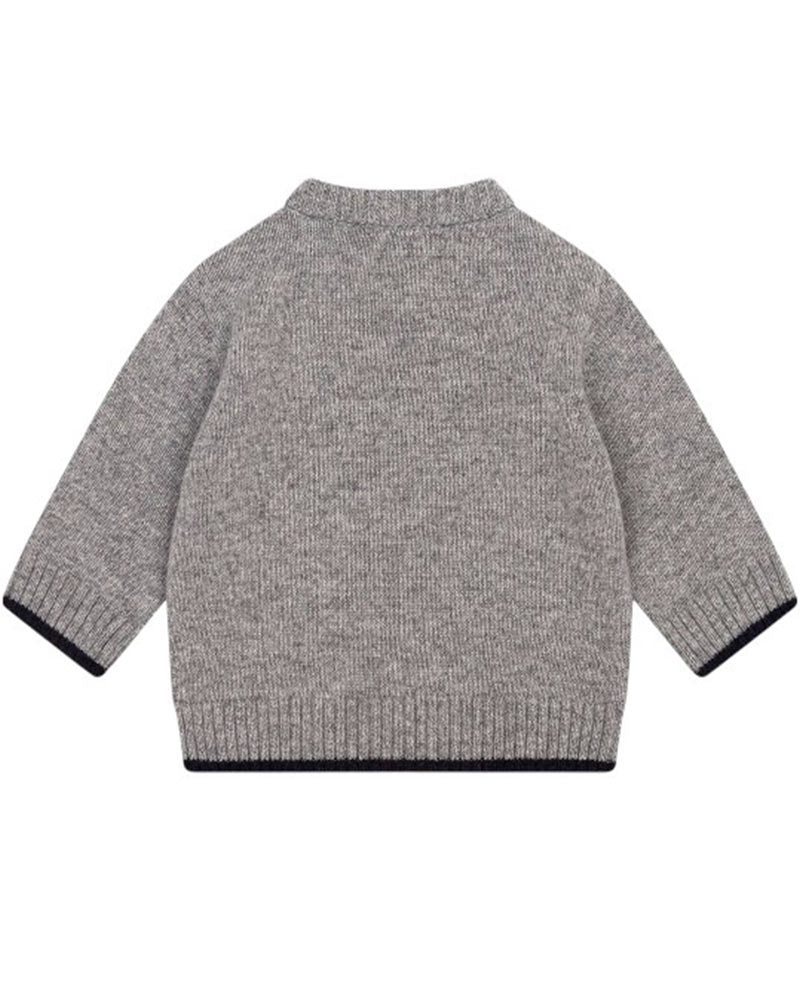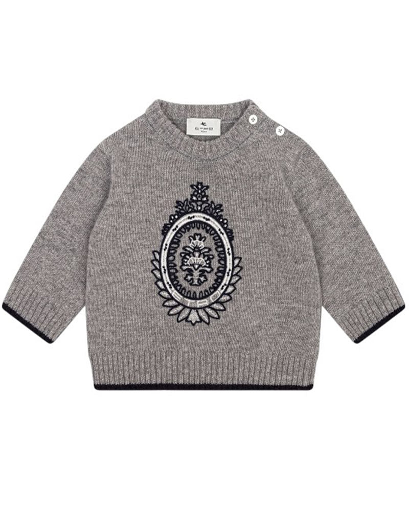 Maglia grigia da neonato realizzata in misto lana a cashmere. Presenta collo tondo, maniche lunghe, chiusura con bottoncini sulla spallina e finiture a coste. È decorata con ricamo sulla parte anteriore.