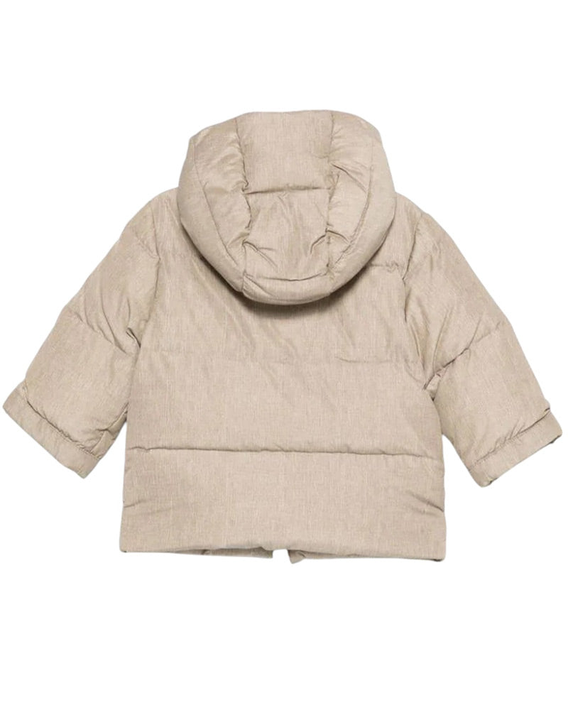 Giubbino imbottito beige da neonato. Presenta design trapuntato, cappuccio fisso, chiusura frontale con zip e alamari, maniche lunghe e due tasche con patta applicate sul davanti.