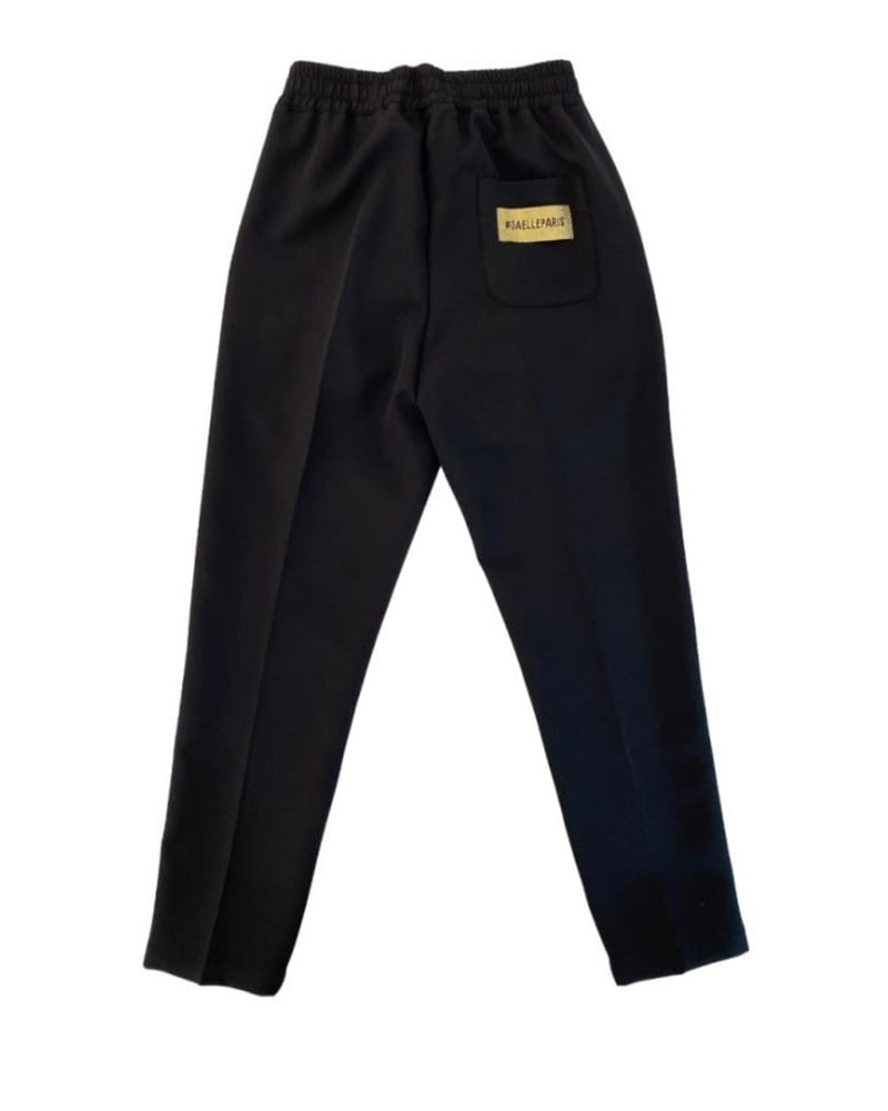 Pantaloni neri carrot fit da bambina. Sono caratterizzati da vita elasticizzata, due tasche laterali all'americana e una tasca con patch logo applicata sul retro.