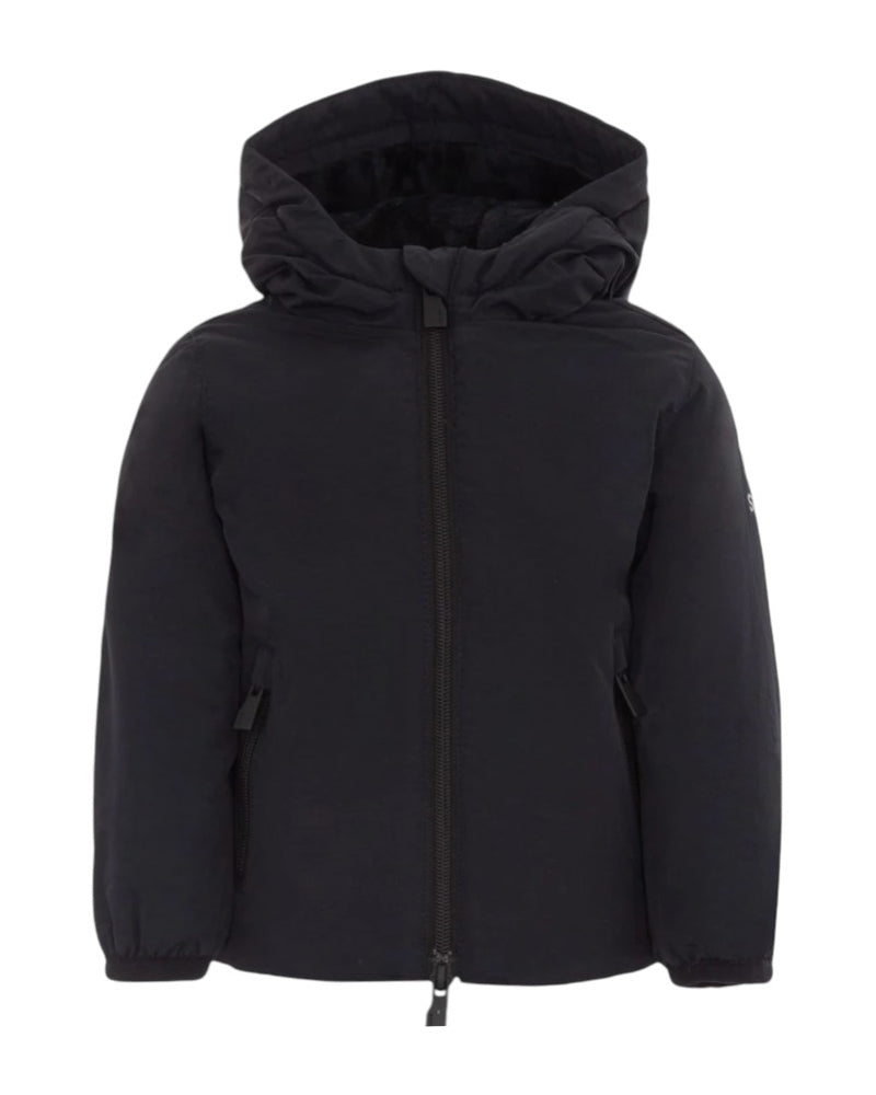 Giubbino imbottito da bambino, realizzato in poliammide. Presenta cappuccio fisso, fodera in tessuto soffice, chiusura frontale con zip, maniche lunghe con polsini elasticizzati, due tasche laterali all'americana con zip e orlo dritto. È decorato con logo stampato sulla manica.