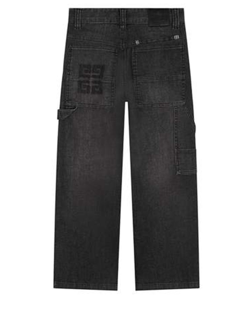 Jeans gamba dritta da bambino realizzati in denim di cotone, modello cinque tasche. Presentano chiusura frontale con bottone a pressione e zip, vita regolabile grazie ad elastico interno con bottoni. Sono decorati con stampa logo all-over.