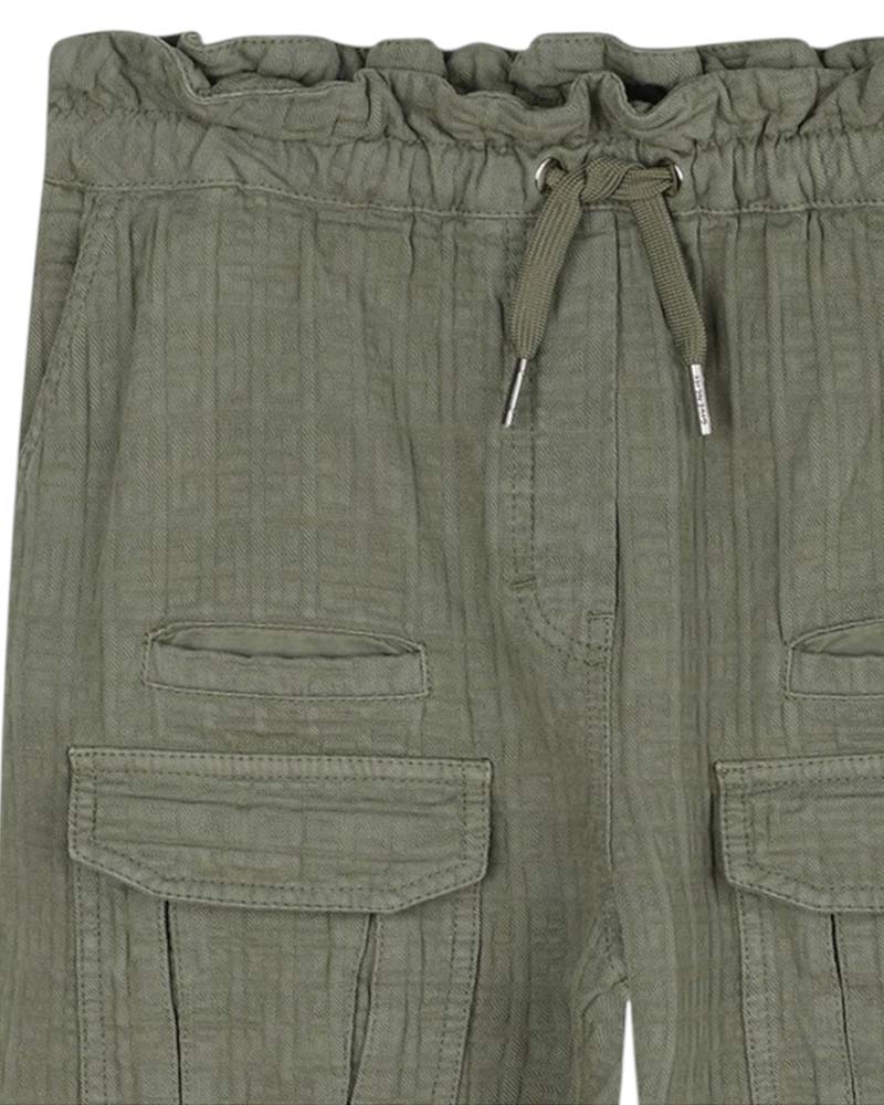 Pantaloni realizzati in cotone da bambina. Presentano trama logo jacquard all-over, vita elasticizzata con coulisse, tasche laterali america, tasche cargo sul davanti e fondo con elastico alla caviglia. Sono decorati con placca logo applicata sulla tasca.