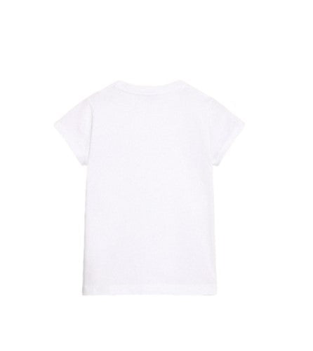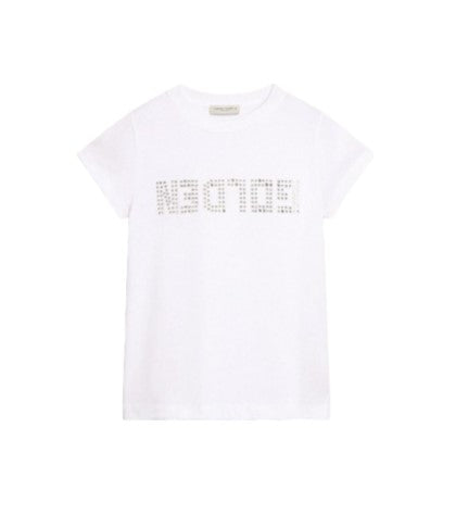 T-shirt da bambina girocollo a manica corta in cotone, applicazione logo in strass sul davanti.