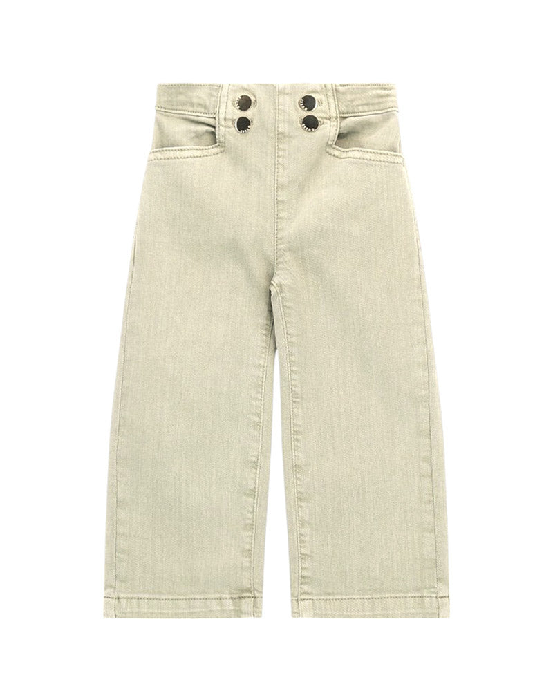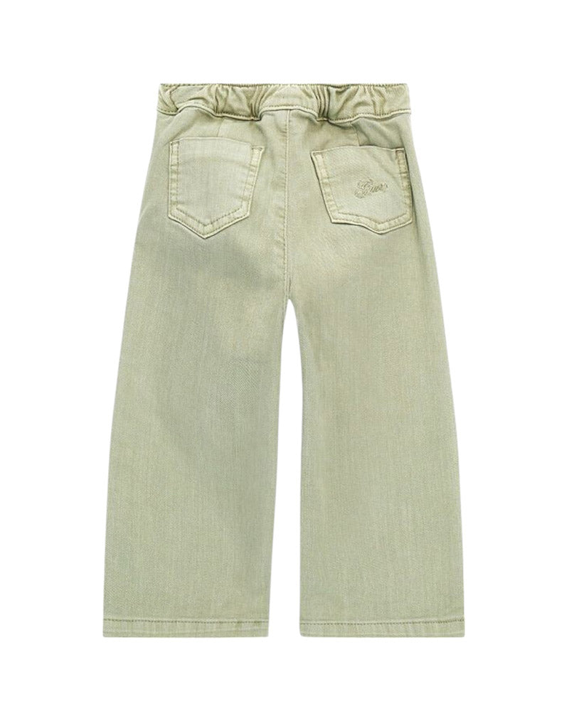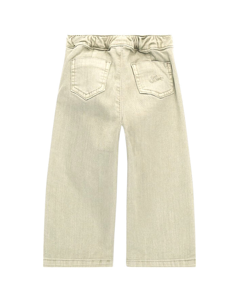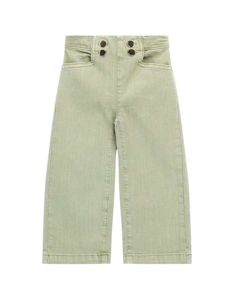 Pantaloni da neonata realizzati in denim di cotone. Presentano vita elasticizzata, quattro bottoncini color oro sul davanti, due tasche laterali decorative e due tasche applicate sul retro. Sono decorati con logo ricamato sul retro.