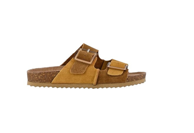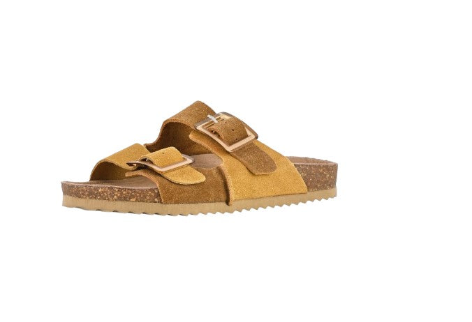 In questo modello in pelle scamosciata la suola è flat e la fascia a doppia fibbia è bicolore.