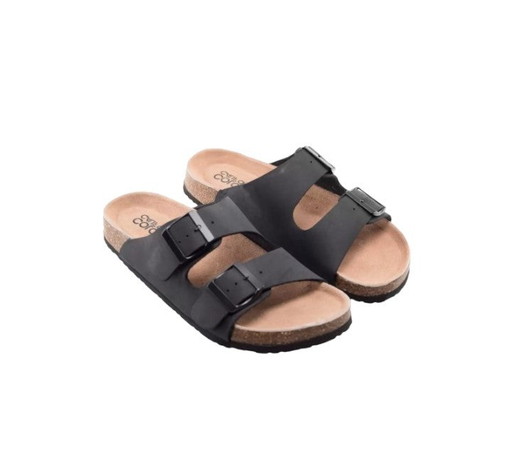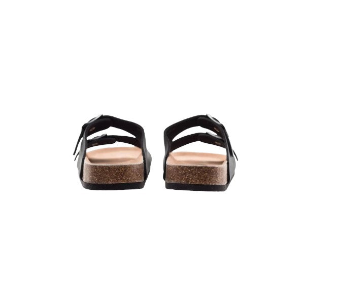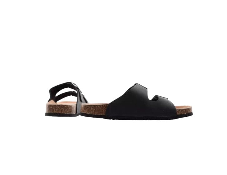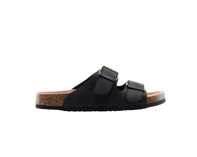Sandali uomo in nabuck nero, fibbie in metallo in tono. Suola in EVA ultramorbida, flessibile e antiscivolo, plantare interno in lattice morbido ergonomico.