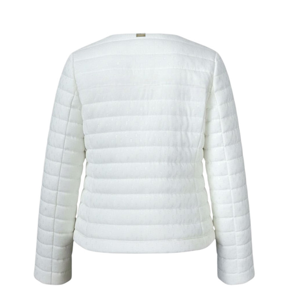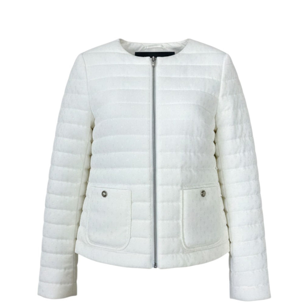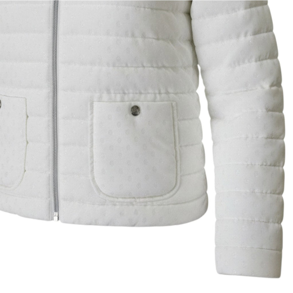 Giubbino 100 grammi, caratterizzato da design trapuntato, scollo rotondo, chiusura frontale con zip, maniche lunghe, due tasche applicate sul davanti e orlo dritto. È decorato con dettagli applicati effetto goccia all-over.