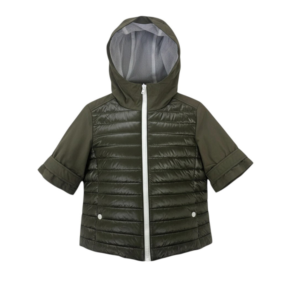 Cappa bi-tessuto 100 grammi, caratterizzata da design trapuntato, cappuccio fisso, chiusura frontale con zip, maniche corte, due tasche laterali a filetto e orlo dritto.