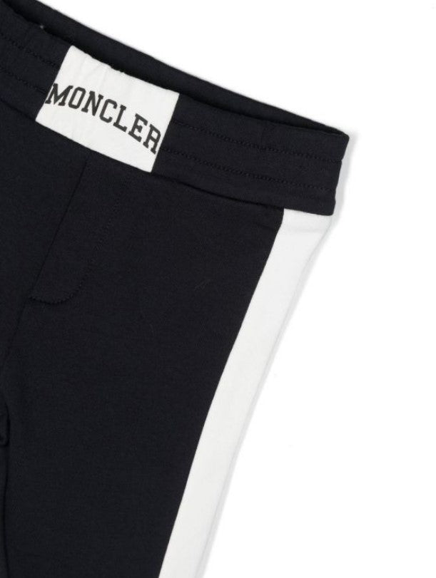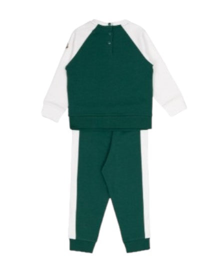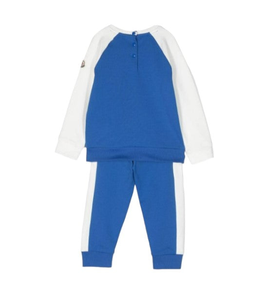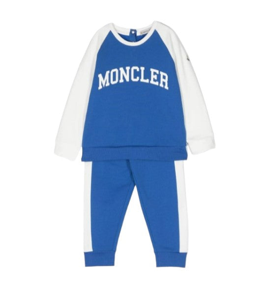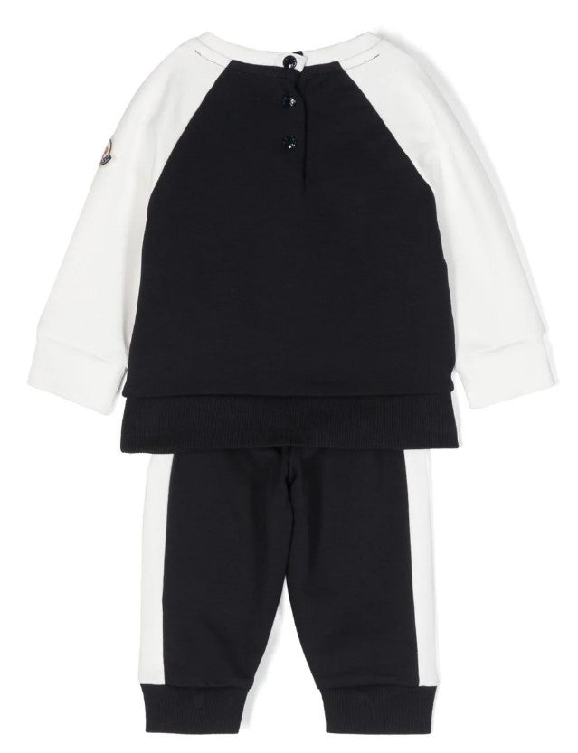 Completo da neonato due pezzi in felpa di cotone. Presenta felpa girocollo a manica lunga con logo frontale, chiusura con clips sul retro, finiture a costa. Pantalone jogger con elastico in vita ed alla caviglia.