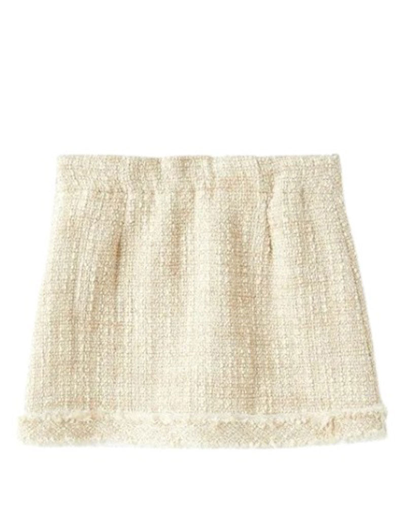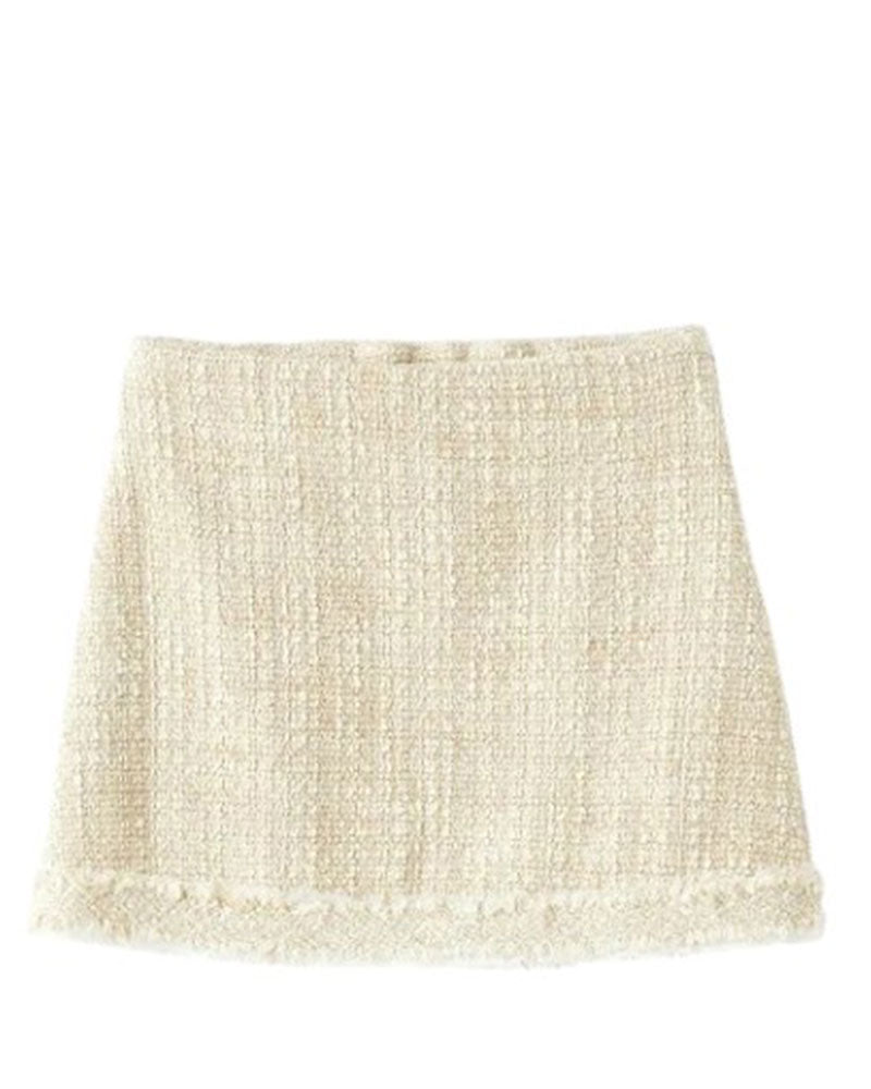Gonna realizzata in tessuto tweed, sfoderato con pannello interno elasticizzato sul retro e bottone per una vestibilità regolabile. Chiusura con zip nascosta sul lato. La gonna è rifinita con bordino sfrangiato sul fondo.
