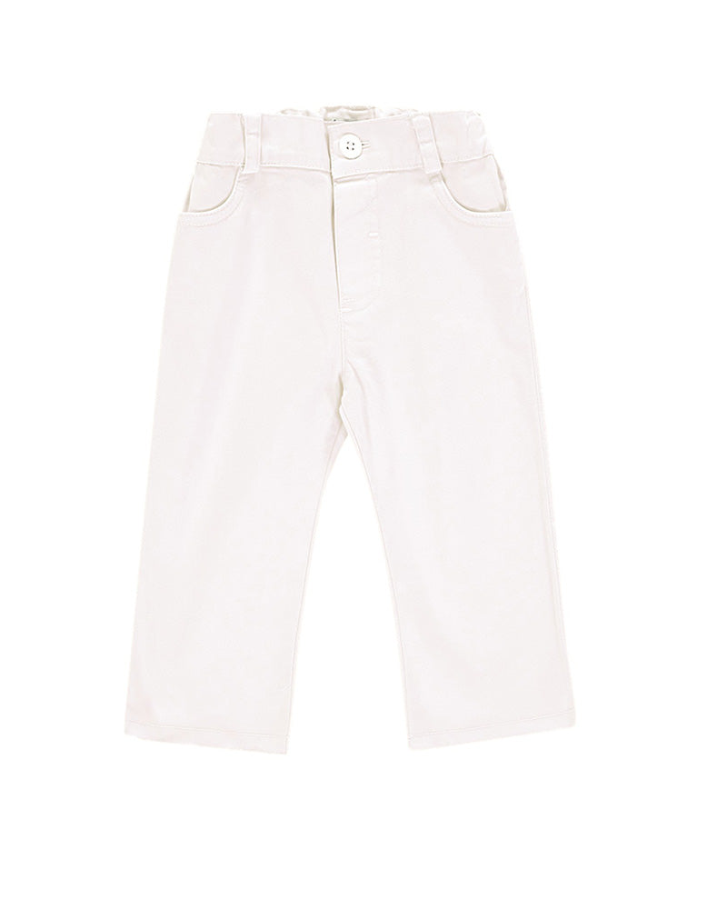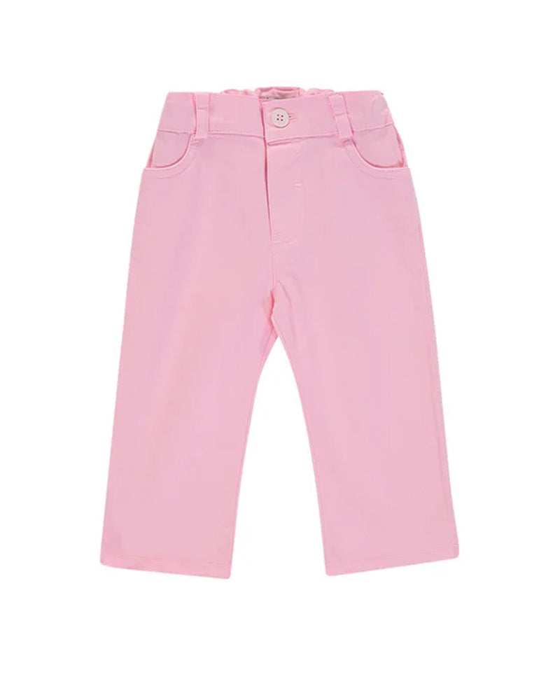 Pantaloni realizzati in cotone, vita elasticizzata, bottone decorativo, tasche applicate sul retro, gamba dritta.