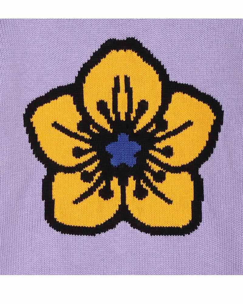 Abito muticolor da bambina realizzata in filato di cotone. Presenta colletto tondo, maniche lunghe e finiture a coste. È decorata con motivo fiore ad intarsio sulla parte anteriore e con applicazione patch logo sulla parte posteriore.