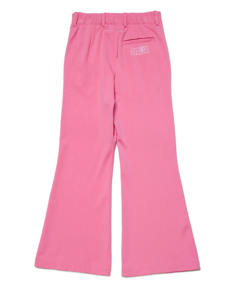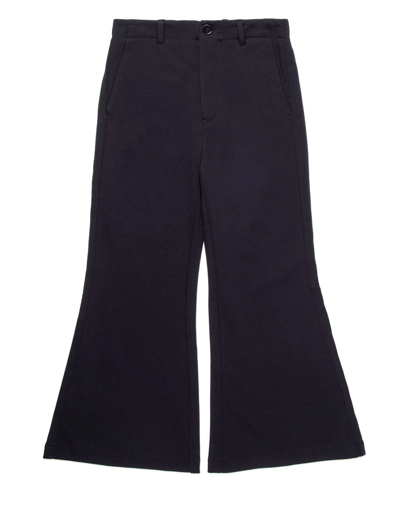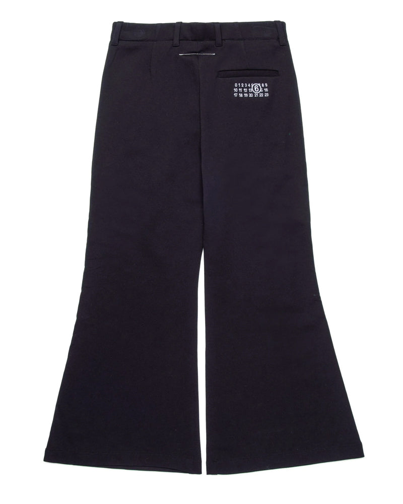 Pantaloni bootcut con motivo numerico e logo ricamato. Presentano passanti per cintura, chiusura frontale con bottoni, tasche laterali e due tasche posteriori a filetto. Modello con taglio a zampa e orlo svasato.