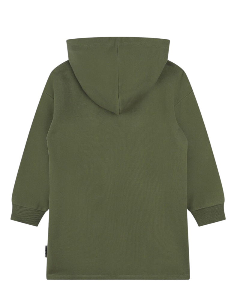 Abito con cappuccio realizzato in felpa di cotone da bambina. Presenta maniche lunghe con polsi elasticizzati, stampa borsa trompe - l'oeil sul davanti, orlo dritto.