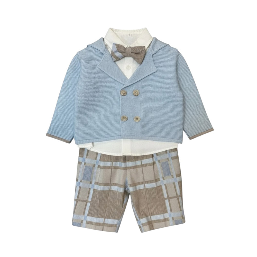 Completo 4 pezzi camicia e papillon removibile cardigan con 4 bottoncini sul davanti pantaloncino lungo a quadri