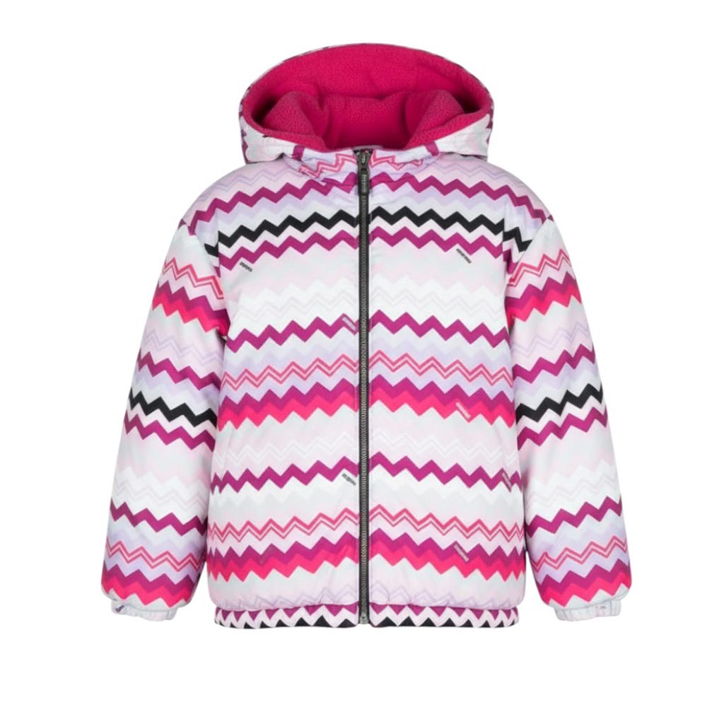 Giubbino reversibile caratterizzato da design imbottito cappuccio fisso, chiusura frontale con zip, maniche lunghe con polsi elasticizzati e orlo elasticizzato. Un lato realizzato in nylon con iconica fantasia del brand e l'altro in pile fucsia con taschino applicato sul petto.