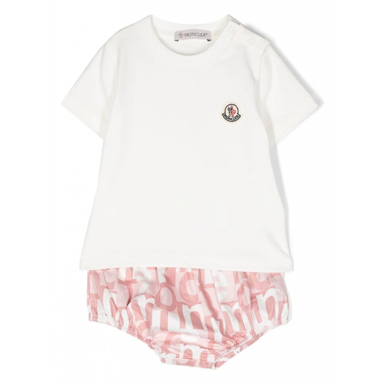 Completo due pezzi composto da t-shirt girocollo con logo applicato, clips sulla spalla e culotte in cotone con logo all over.