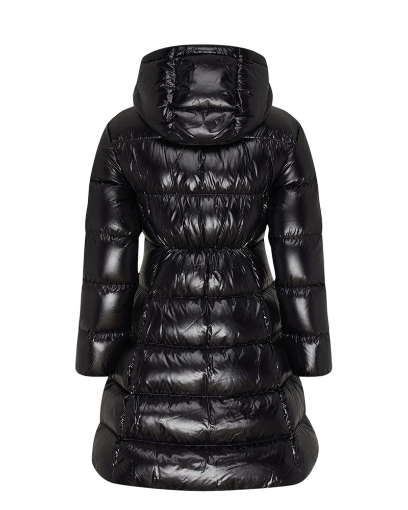Giubbino imbottito lungo Bellevue, realizzato in poliammide semilucido. Presenta design trapuntato, cappuccio fisso, chiusura frontale con zip e bottoni a pressione, maniche lunghe con polsi elasticizzati e due tasche laterali con zip. È decorato patch logo applicata sulla manica.