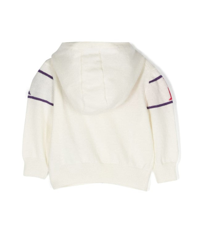 Cardigan con zip e cappuccio da neonato realizzato in lana, logo multicolor intarsiato sul davanti, polsi ed orlo a costa.
