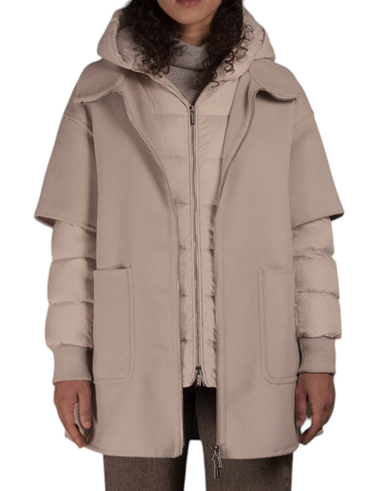 Cappa unita a un caldo piumino staccabile con cappuccio. Il capo esterno è realizzato con una calda lana misto cashmere double ribattuto a mano. Chiusura davanti con luminosa zip a doppio cursore. Tasche a toppa. Al suo interno il pratico piumino in piuma d’oca trapuntato a boudin realizzato in un luminoso tessuto tecnico down proof con effetto riflettente.