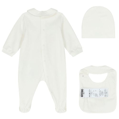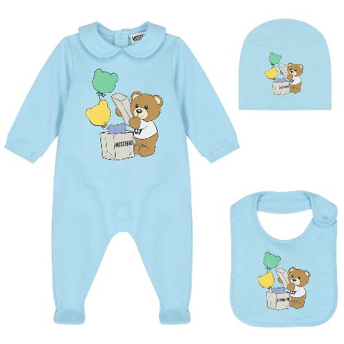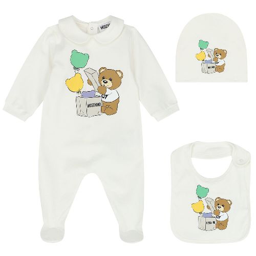 Tutina+Cappello+Bavetta Moschino con Teddy e palloncini sul davanti.