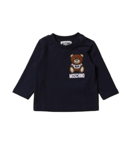T-shirt girocollo a maniche lunghe con logo ricamato e simbolo applicato sul davanti, chiusura con bottoni a pressione sulla spalla.
