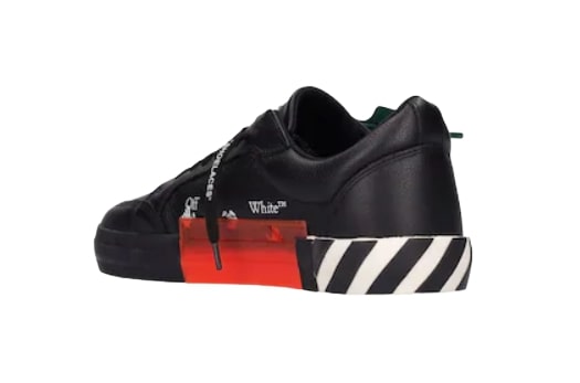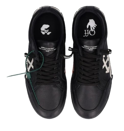 Sneakers vulcanized off-white in pelle lacci punta tonda etichetta logo applicata linguetta patch logo applicata laterale tag iconico verde applicato