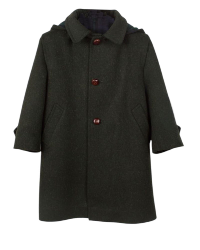 Cappotto monopetto realizzato in pura lana vergine. Presenta colletto a punta, cappuccio removibile, maniche lunghe, chiusura con bottoni sul davanti e due tasche america laterali.