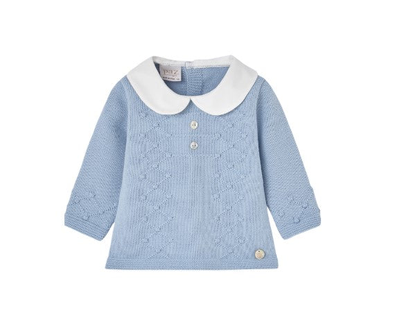 tutina 2 pezzi con motivo a rombi e pom pom sulle maniche e davanti. Collo da bebè in tessuto a contrasto. Dettaglio di bottoni decorativi in madreperla. Placca di madreperla PAZ sul fondo. Chiusura posteriore con bottoni coordinati.
