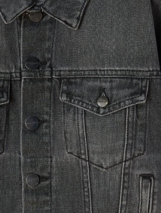Giubbino in denim, chiusura frontale con bottoni, tasche applicate sul petto, tasche alterali a filo, stampa logo in contrasto sul retro.