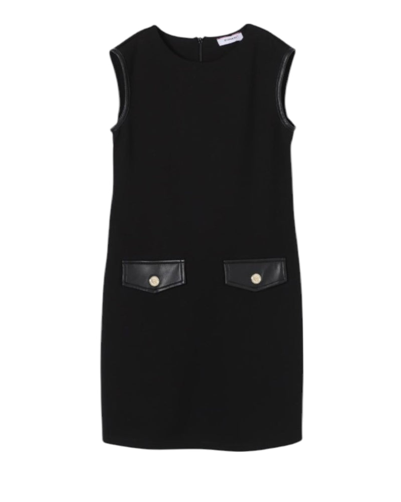 Abito nero da bambina realizzato in misto viscosa. Presenta colletto tondo, giromanica con bordi in similpelle, due tasche decorative con patta in similpelle applicate sul davanti, chiusura posteriore con zip e orlo dritto.