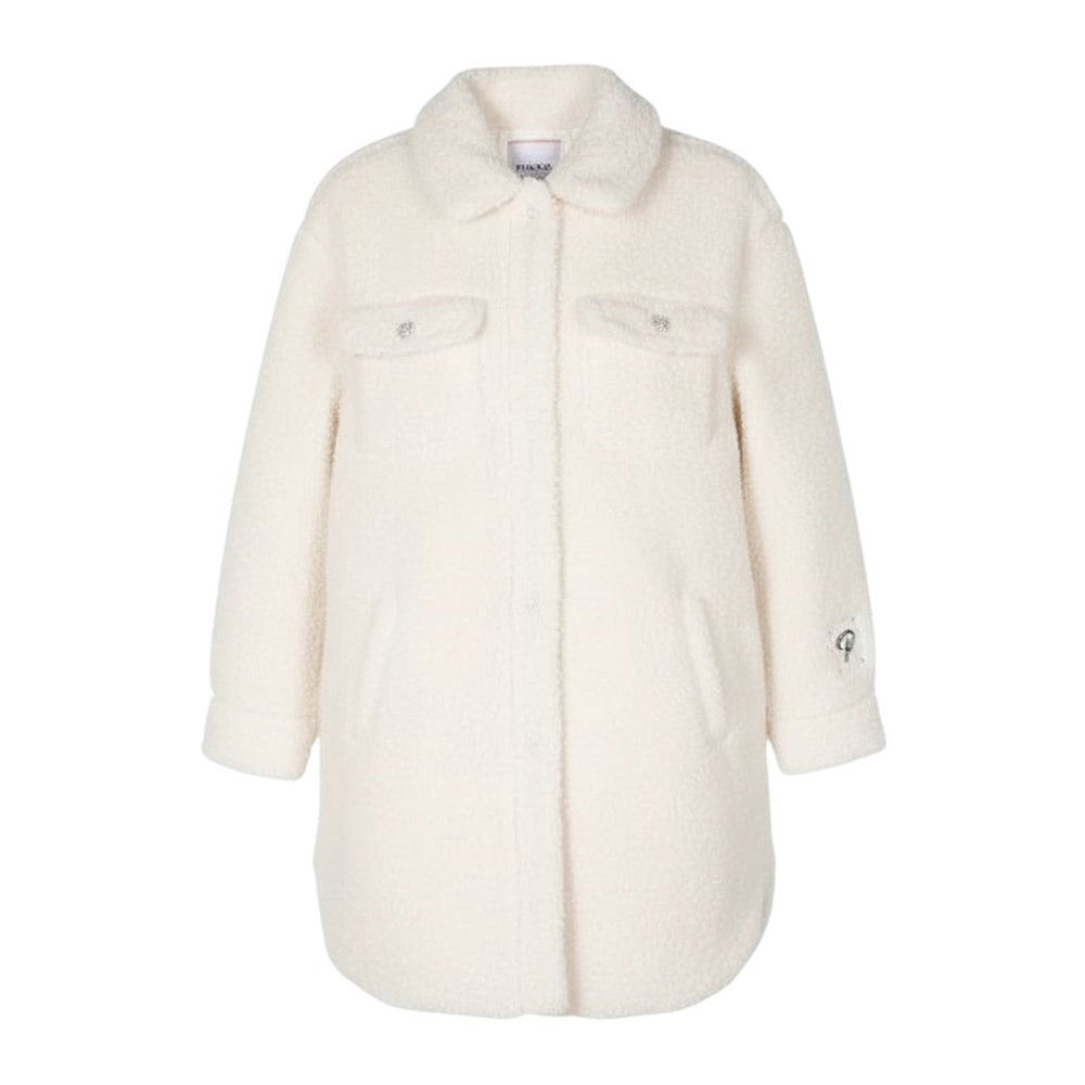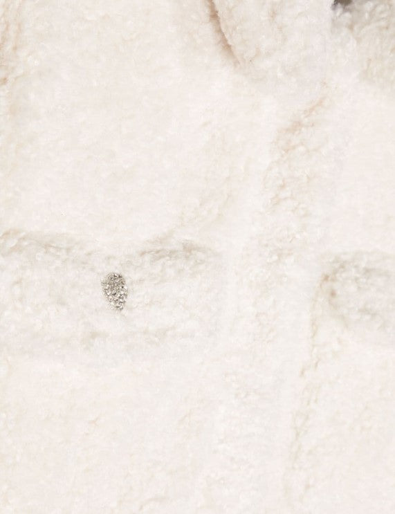 Giacca Teddy modello camicia da bambina, caratterizzato da colletto classico, chiusura frontale con bottoni a pressione, maniche lunghe, due tasche laterali a filetto, due tasche con patta applicate sul petto e orlo curvo. È decorato con patch logo applicata sulla manica e dettagli gioiello applicate sulle tasche.