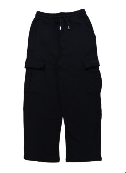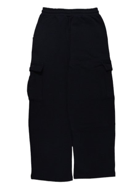 Pantalone jogger in felpa di cotone a palazzo, elastico e coulisse in vita, tasche laterali rotonde, tasconi cargo applicati sulle gambe.