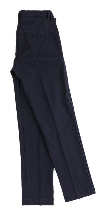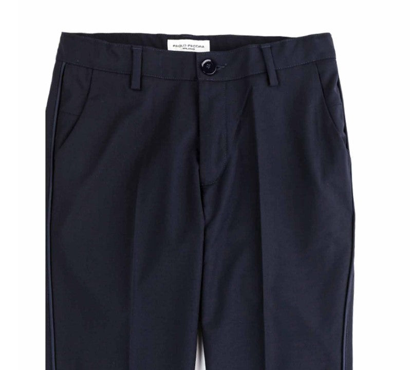 Pantalone classico, chiusura anteriore con zip e bottone, tasca america, due tasche sul retro.