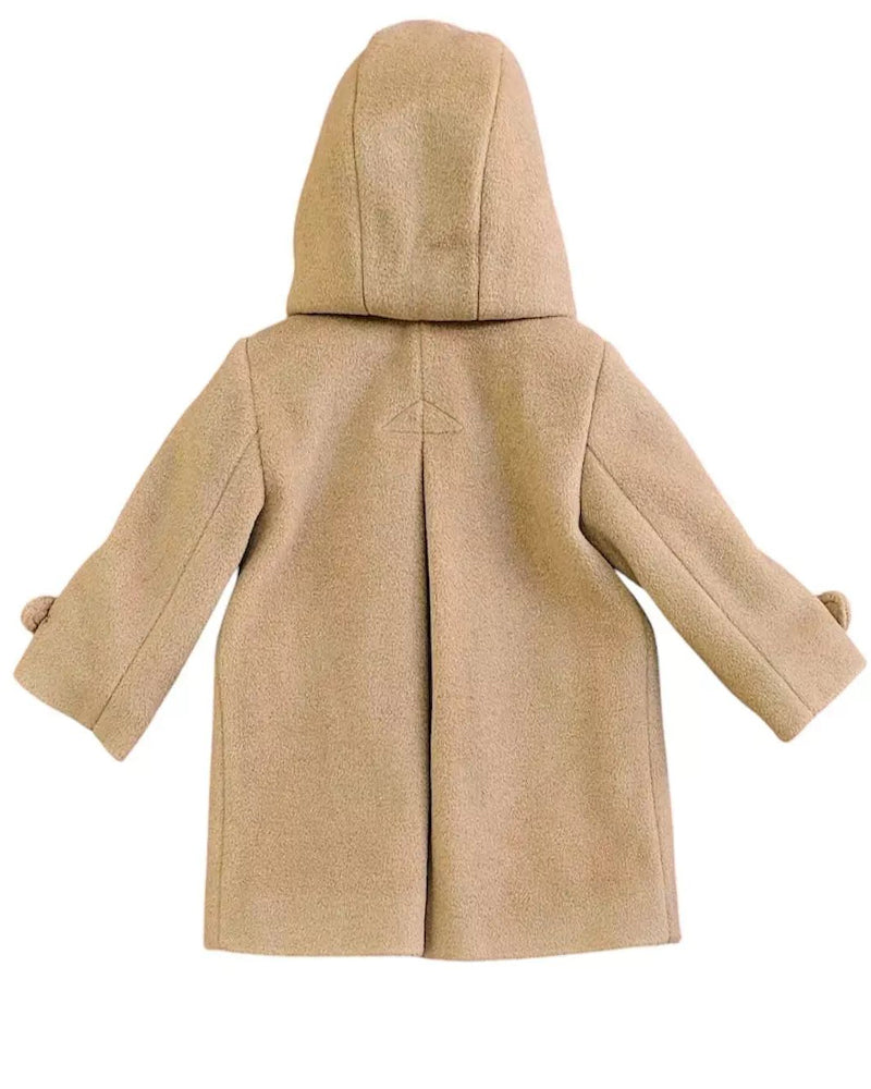 Montgomery realizzato in panno da neonato. Presenta con collo alto, cappuccio removibile, maniche lunghe con bottoni sui polsini, chiusura frontale con zip nascosta e alamari, due tasche con pattina sul davanti e orlo dritto.