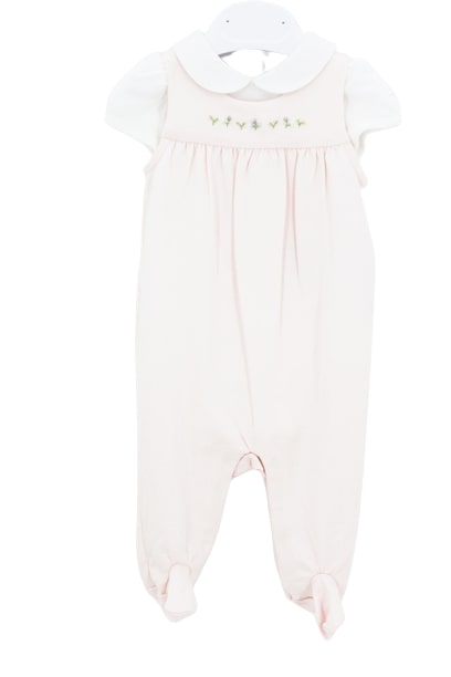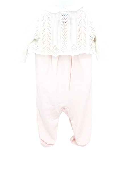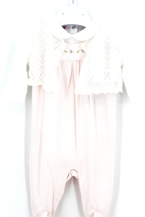 Tutina giro maniche rosa con piedini e ricami sul davanti.