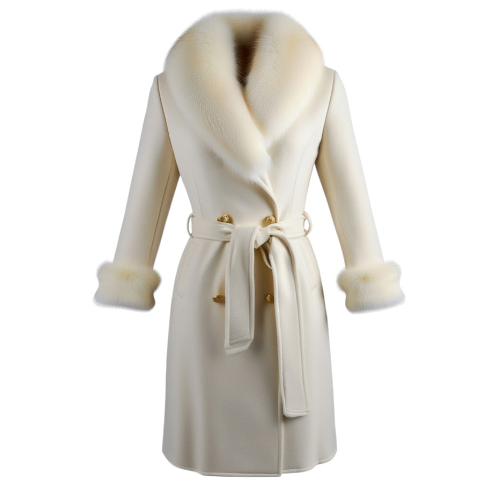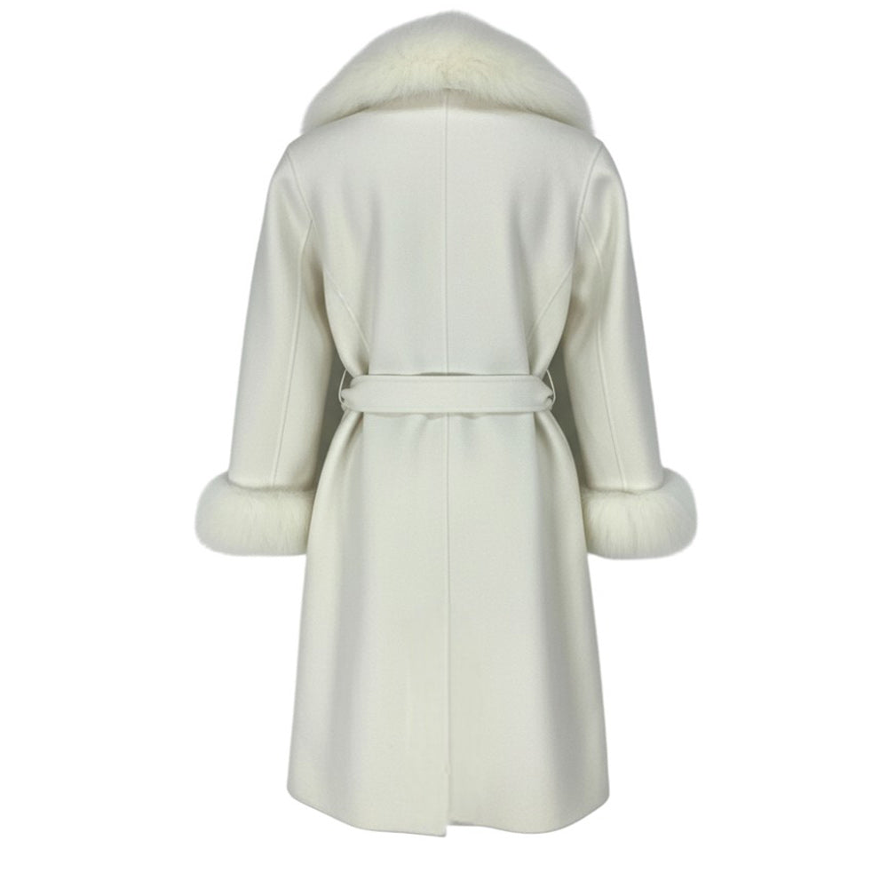 Elegante cappotto in pregiato panno di puro cashmere, caratterizzato da una silhouette sofisticata e dettagli di lusso. Il collo sciallato è impreziosito da una raffinata finitura in pelliccia di volpe rimovibile, mentre la chiusura frontale con bottoni e la cintura in vita valorizzano la figura. Completano il modello le tasche laterali all'americana e le maniche lunghe con polsi in pelliccia rimovibile, per un look esclusivo e senza tempo.